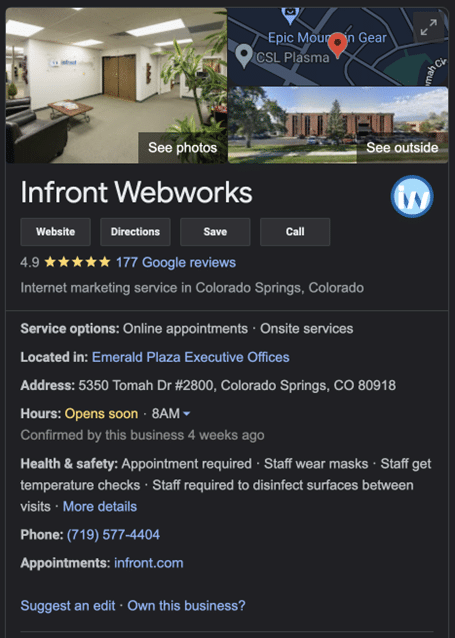 It’s important to note you cannot suggest new information for Google to use. Google also removes anything that qualifies as advertising, so stick to the facts. Consider adding your social media profiles (including your Linkedin) and update photos to include real-world views.